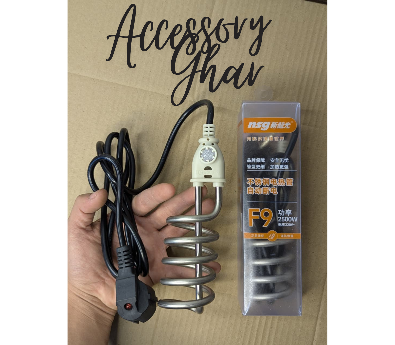 Fast-heating 2500W F9 rod with auto temperature cut-off — premium, safe and budget-friendly alternative to geysers and gas heaters.